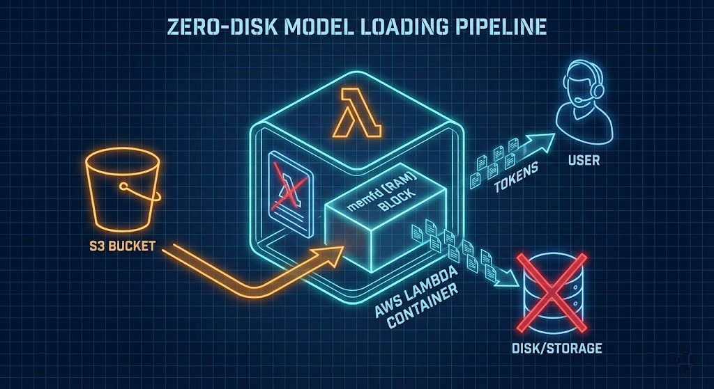 Since we can’t save our 4GB model to disk without breaking SnapStart, we use a Linux kernel trick: memfd_create. This is the “S3-to-RAM” pipeline, and it’s the only way to fly in 2026.