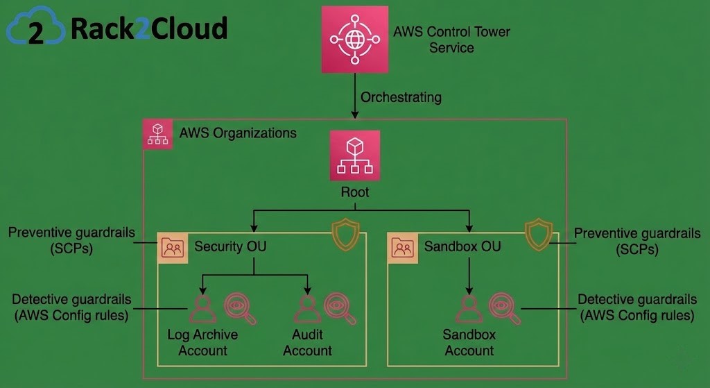 AWS: Organizations and OUs AWS uses AWS Organizations and Organizational Units (OUs). Control Tower mandates a specific starting structure: A Security OU (for log archive and audit) and a Sandbox OU.