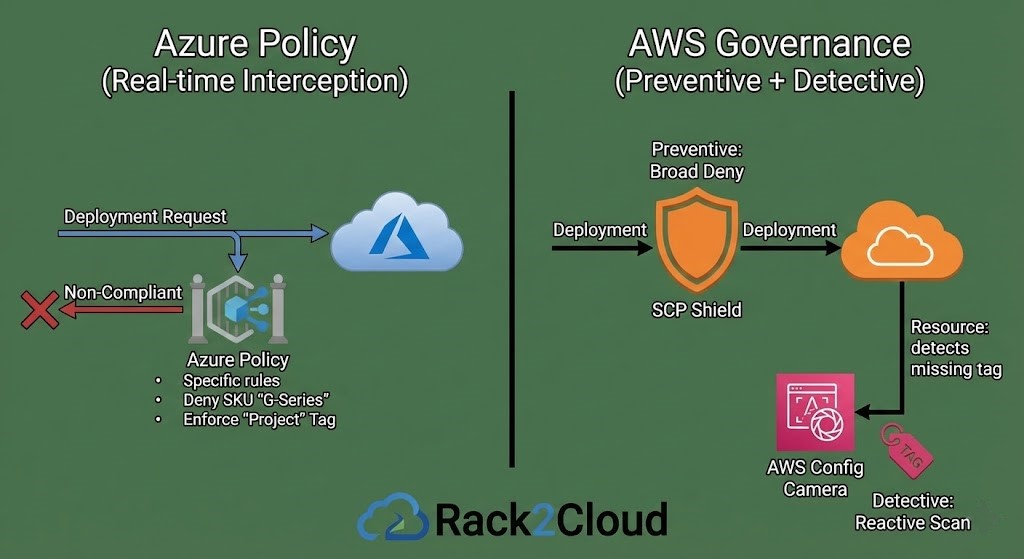 Image 3: Governance Engine Comparison. This diagram illustrates the fundamental difference between Azure Policy’s real-time interception and AWS’s combination of broad preventive shields (SCPs) and reactive detective scans (AWS Config).