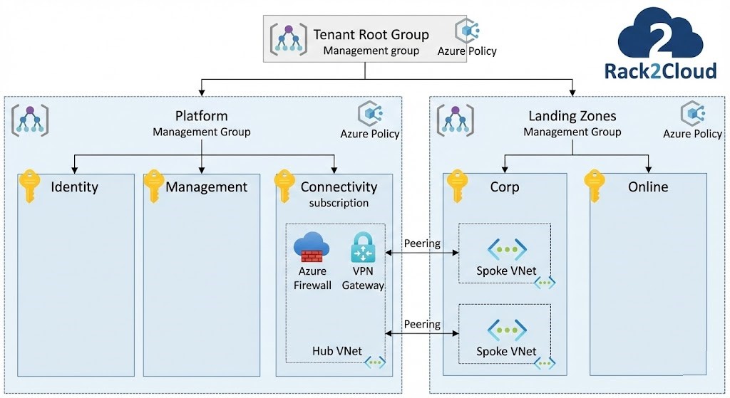 Image 1: Azure Enterprise-Scale Landing Zone Architecture. This diagram highlights the Management Group hierarchy for policy inheritance and the Hub-and-Spoke network topology.