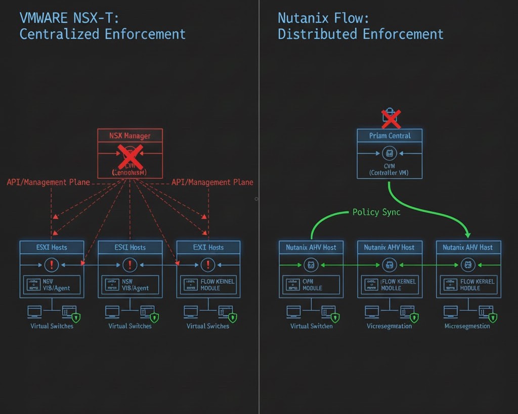 - In Nutanix Flow: The security engine is baked directly into the AHV OVS (Open vSwitch) kernel. While Prism Central is used to configure policies, the enforcement is decentralized and local to every node.