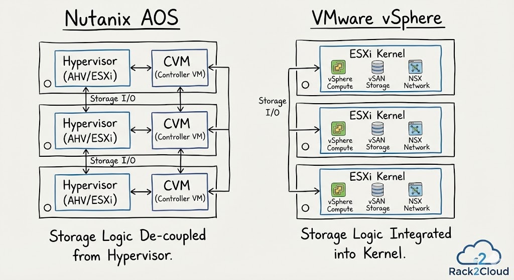 - Nutanix Side: “Nutanix runs its storage logic in a Controller VM (CVM) sitting above the hypervisor. This allows them to decouple storage features from the hypervisor kernel, enabling faster feature updates and hypervisor neutrality (AHV, ESXi, etc.). The CVMs communicate to create a distributed storage fabric.”