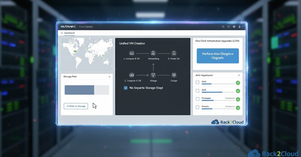 - Prism Central (The Single Pane): Start here. Show how one interface manages clusters globally, handles upgrades (LCM), and provides analytics.