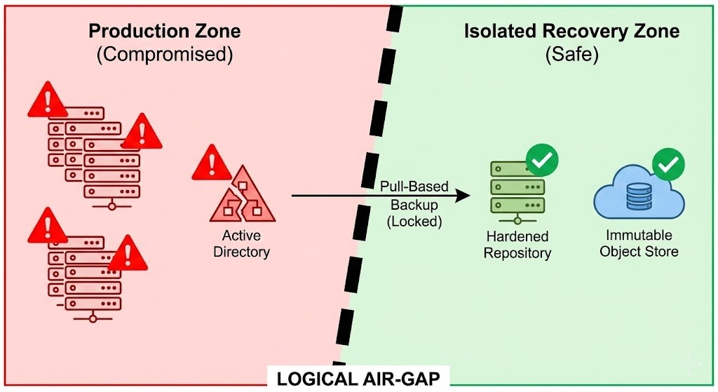 A logical air-gap is network and identity isolation that ensures the backup environment can survive total devastation of the production environment. If your Active Directory is nuked, your backup console must still be accessible.